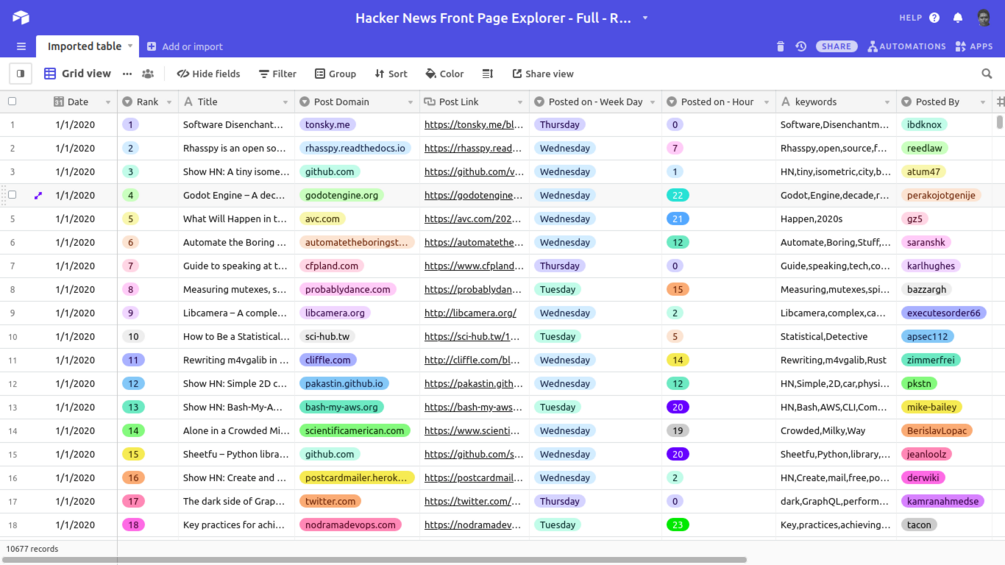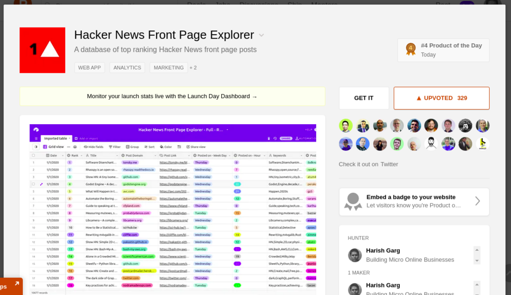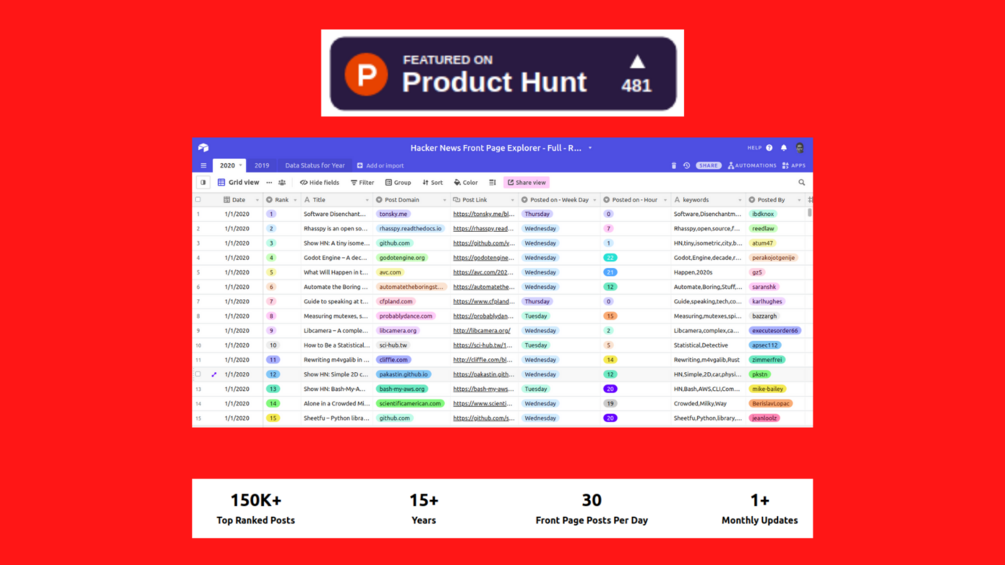- You are about to launch something(products, startups, books, blogs, podcasts, etc.) and want to get on the front page of Hacker News, this will be a good database for you to refer to understand what kind of posts get ranked on the front page.